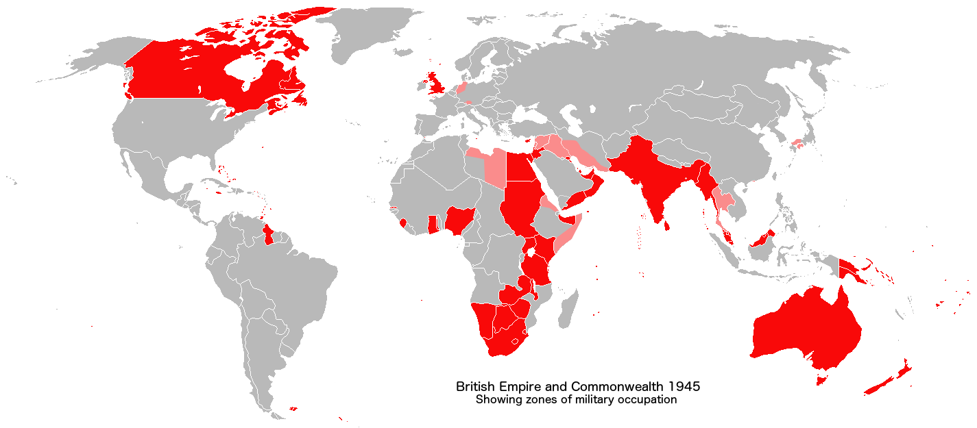 The British Empire in 1945. The territories coloured in pink (military occupation) were not part of the Empire. At the end of WW2, Britain was still a world empire, but that empire, weakened by two world wars, was crumbling. Nevertheless, the British would still consider themselves a global power. Map : © Wikipedia.