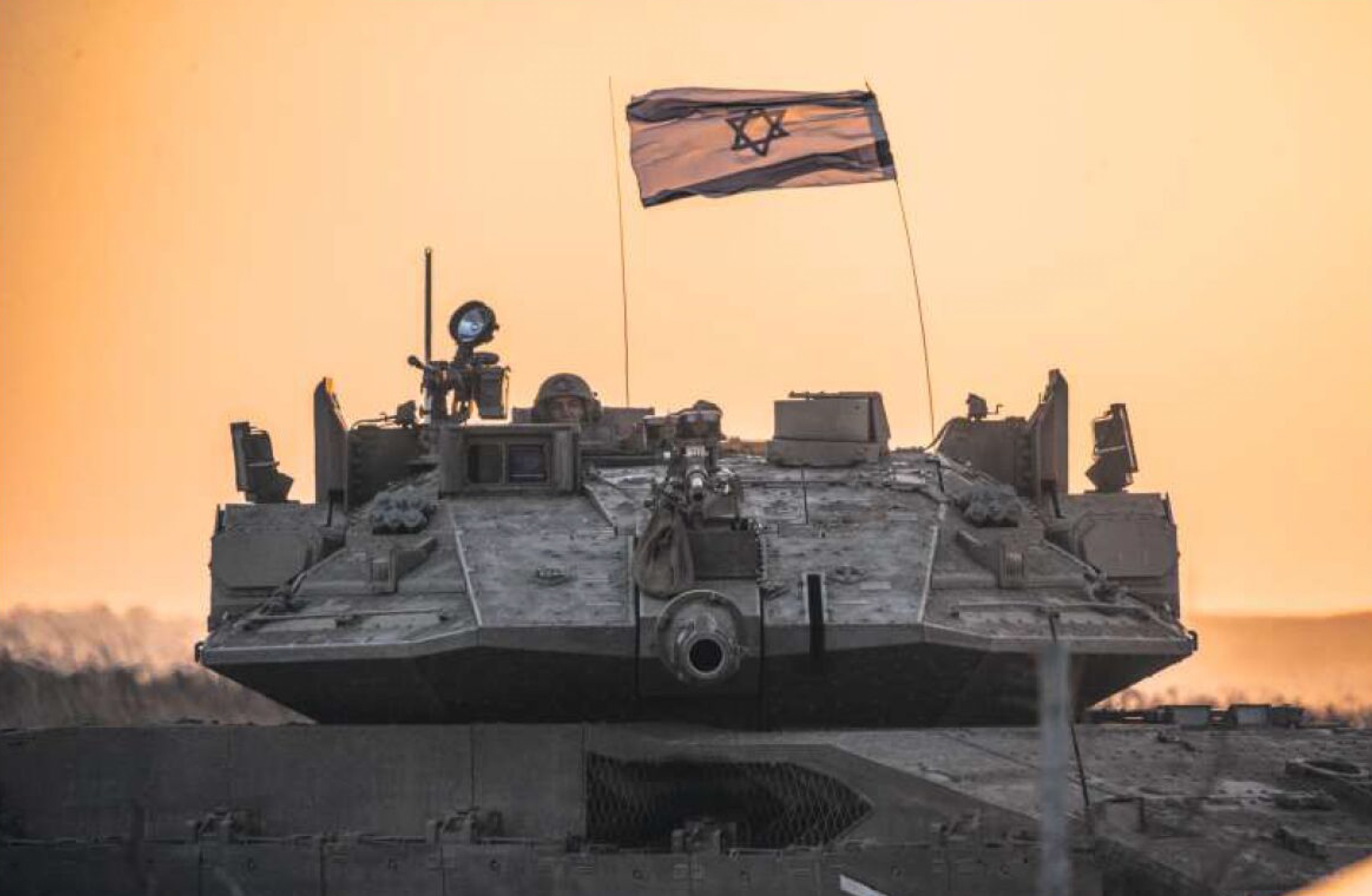 Un char israélien Merkava à Gaza en octobre 2023. À la suite des massacres du 7 octobre, Israël réagit, comme il était prévisible, par la manière forte. C'est une situation d'escalade, où Israël l'emporte militairement à l'échelle locale, mais où le Hamas gagne des points à l'échelle mondiale : la protestation contre le « génocide » à Gaza mobilise les foules, de l'Europe aux universités américaines. Par ailleurs, plusieurs États européens, dont la France, ont reconnu l'État de Palestine, ce qui là encore est un revers pour Israël. Les États-Unis ont soutenu sans faille l'effort militaire israélien, jusqu'à mener une opération conjointe contre les installations nucléaires de l'Iran. Donald Trump, ayant permis à Israël de vaincre l'Iran, le Hezbollah libanais et le Hamas, a pu imposer son plan de paix à Benyamin Netanyahou. L'armistice tient pour l'instant, mais le succès du plan Trump n'est pas encore acquis.