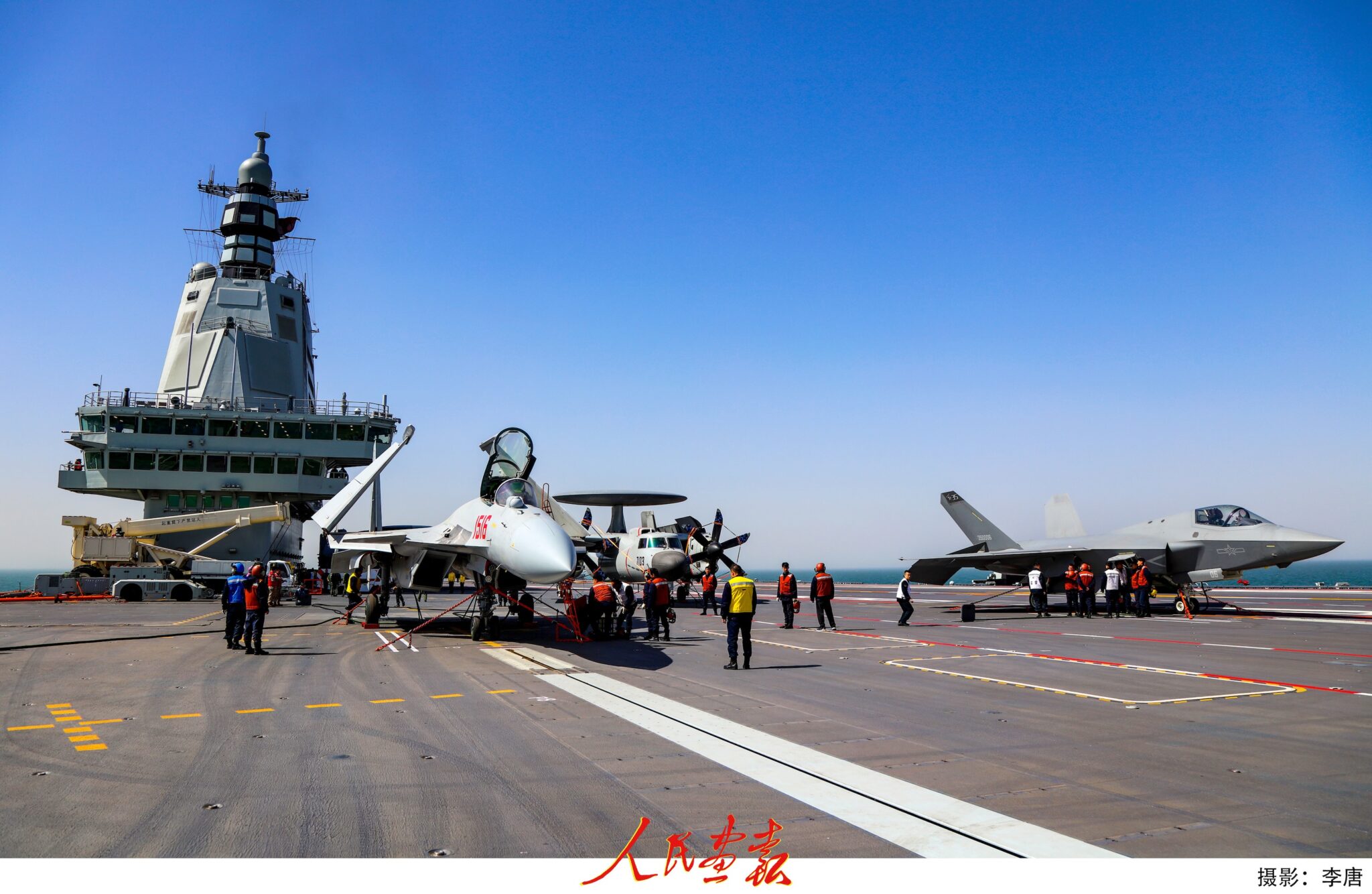 The flight deck of Fujian, featuring the carrier's “island” with a state-of-the-art phased-array RADAR, a J-15 fighter (the copy of a Russian design), a KJ-600 early warning aircraft and a 5th generation J-35 stealth fighter.
