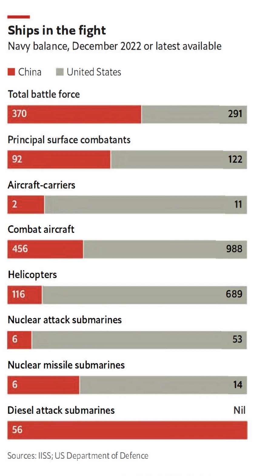 Although the US Navy still has a significant edge over the People's Liberation Army Navy (PLAN, the Chinese navy), the latter now has a larger number of vessels and is gaining momentum. Another source of concern is that the PLAN could achieve local superiority in the waters adjacent to its territory, like in the South China sea or the strait of Taiwan, while US naval assets are scattered all over the world. As of 2025, China has three aircraft carriers (all non-nuclear powered) and the fourth one is nearing completion.