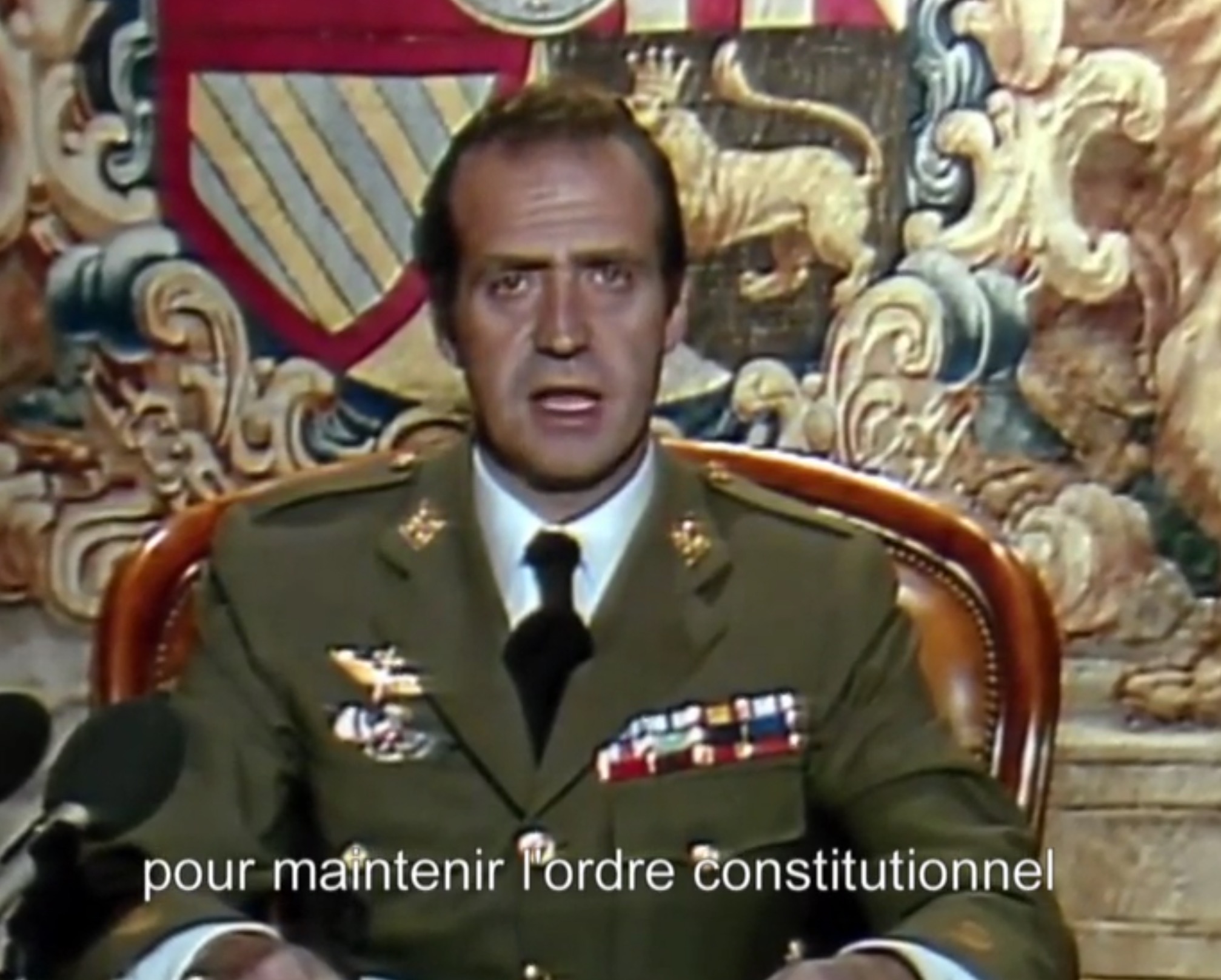 L'intervention télévisée où le roi Juan Carlos appelle l'armée au respect de la constitution après la tentative de coup d'État du 23 février 1981. En uniforme, Juan Carlos utilise sa légitimité de roi et de chef des armées pour sauver la démocratie.
