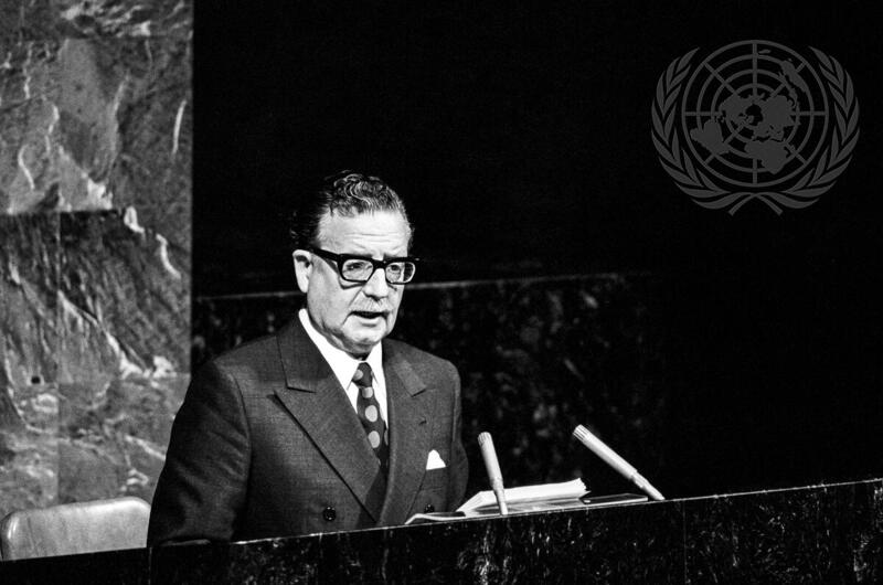 Le président chilien Salvador Allende parle devant l'Assemblée générale de l'ONU à New York le 4 décembre 1972. Élu en 1970 à la tête d'une coalition de gauche, l'Unité Populaire, Allende meurt lors du coup d'État du 11 septembre 1973. Le Chili devient une dictature militaire jusqu'en 1990. Deux raisons peuvent expliquer le destin tragique d'Allende : d'une part qu'il ait entrepris des réformes radicales alors qu'il ne disposait que d'une majorité relative dans un pays profondément divisé ; d'autre part, à l'échelle mondiale, le contexte de la Guerre froide, dans lequel les États-Unis ne pouvaient pas tolérer l'existence d'un nouveau gouvernement pro-soviétique (après celui de Cuba) en Amérique latine.