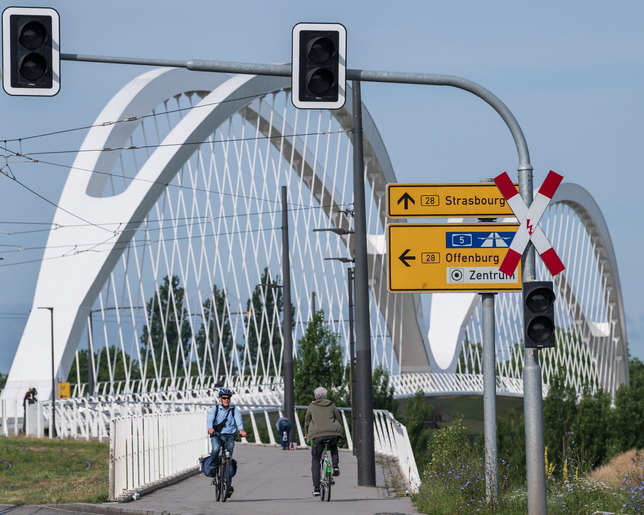 La frontière franco-allemande : la France et l'Allemagne, après s'être affrontées dans trois guerres de 1870 à 1945, se sont associées dans la Communauté puis l'Union européenne. Autrefois ligne de démarcation à laquelle il fallait s'arrêter, la frontière est maintenant incluse dans un espace de libre circulation, l'espace Schengen. Elle n'en distingue pas moins deux souverainetés, deux États et deux économies qui présentent des caractéristiques différentes, deux nations qui ont aussi leur langue et leur culture propres. On voit ici la Passerelle des deux rives, édifiée en 2004 au-dessus du Rhin qui marque la frontière. Du côté allemand, c'est la ville de Kehl et du côté français Strasbourg. La passerelle a été conçue comme un symbole de réconciliation entre la France et l'Allemagne.