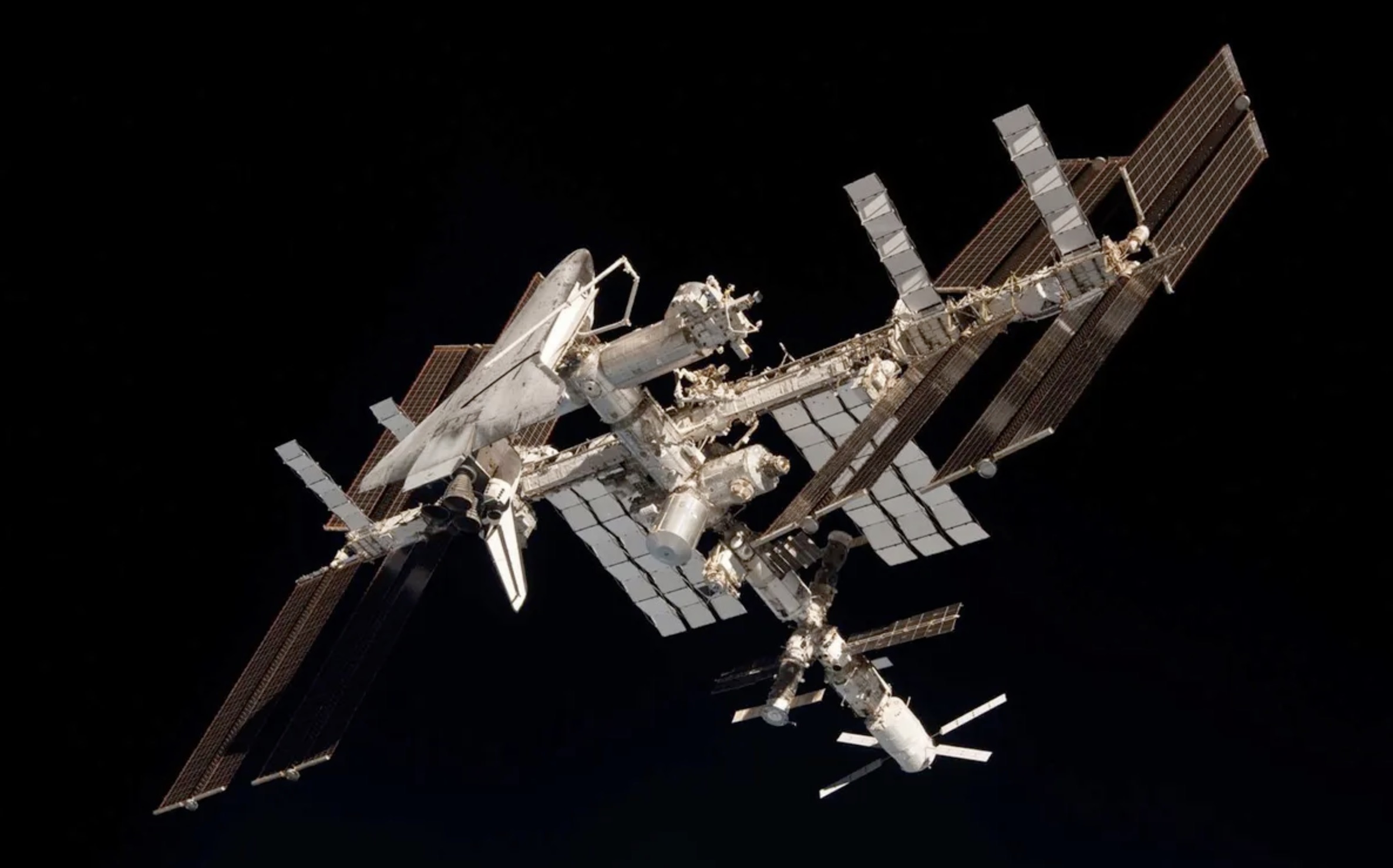 L'ISS (International Space Station) avec la navette spatiale Endeavour, dont c'était le dernier vol, à une altitude d'environ 350 km. Photo prise le 24 mai 2011 par le spationaute italien Paolo Nespoli, de l'Agence spatiale européenne (ESA) lors de l'expédition 27 depuis Soyouz TMA-20, alors qu'il quittait la station spatiale internationale. © ESA/NASA.