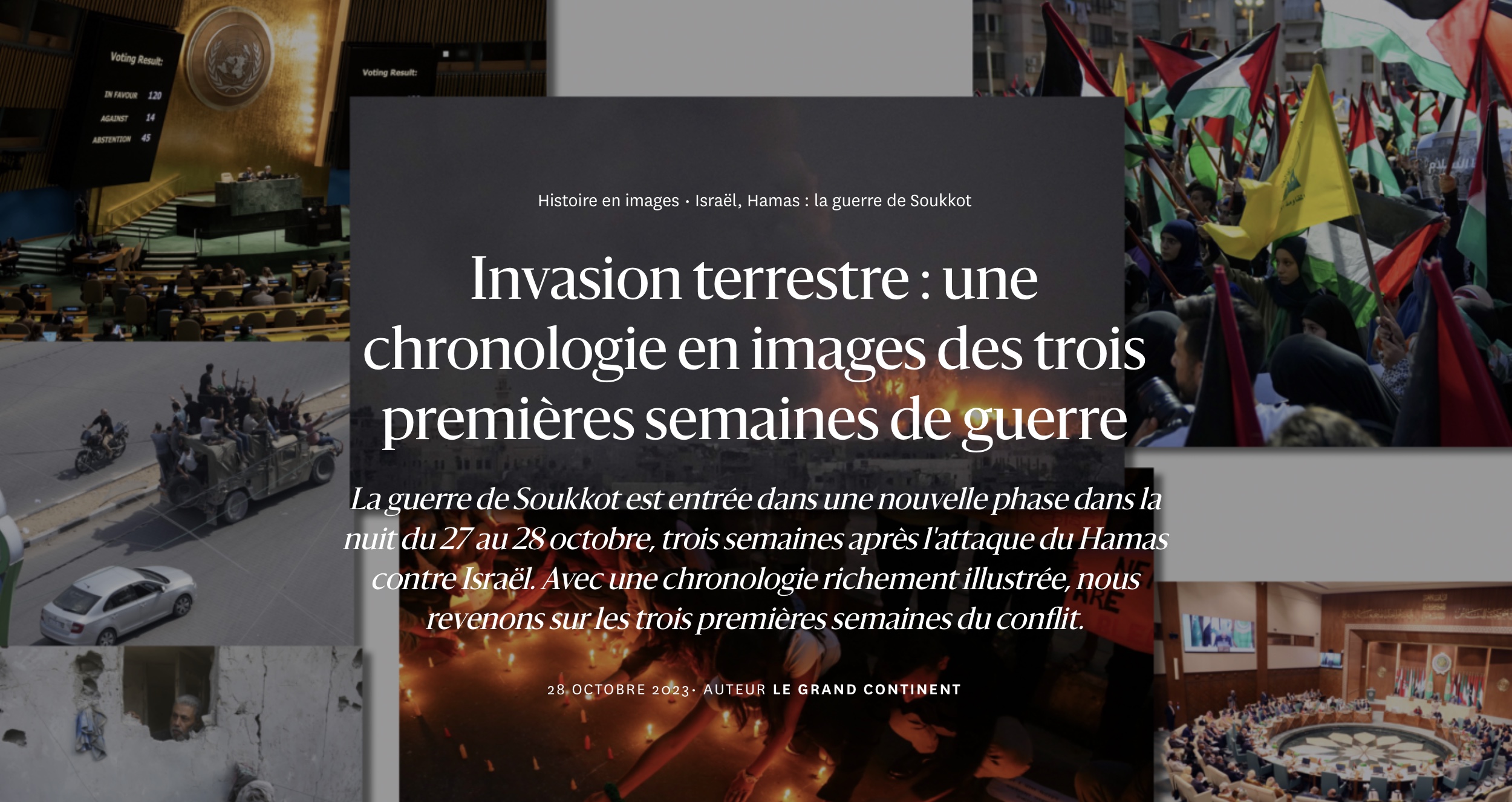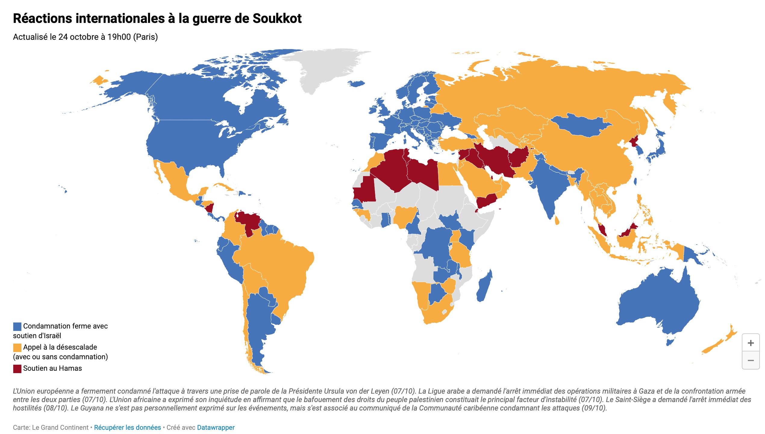 Un conflit asymétrique, la « guerre de Soukkot », entre le Hamas et Israël, sur le site de la revue de géopolitique Le Grand Continent. Les conflits asymétriques opposent des protagonistes aux capacités inégales et souvent de nature différente. Le mouvement Hamas (« Mouvement de la résistance islamique »), au pouvoir dans la bande de Gaza, territoire palestinien, a lancé le 7 octobre des attaques terroristes contre la population civile israélienne proche de Gaza. Israël réplique par des opérations aériennes et par des incursions terrestres, afin de mettre hors de combat les forces à l'origine des tueries du 7 octobre. Le Hamas réagit à son tour par une propagande qui insiste sur le martyre de la population de Gaza bombardée par l'armée israélienne. Dans le monde, ce conflit crée des clivages importants, notamment en France où il divise aussi bien la société que la classe politique. La carte ci-dessous, provenant de la même source, montre les lignes de fracture à l'échelle mondiale : condamnation du Hamas et soutien à Israël pour l'Occident, attitude réservée de la plupart des pays du Sud et de la Russie, enfin soutien au Hamas de la part de certains pays musulmans, mais aussi d'États très hostiles aux États-Unis comme le Vénézuela et la Corée du Nord. On observera que la Turquie n'a pas condamné le Hamas et que la Russie en a reçu une délégation au début du conflit.