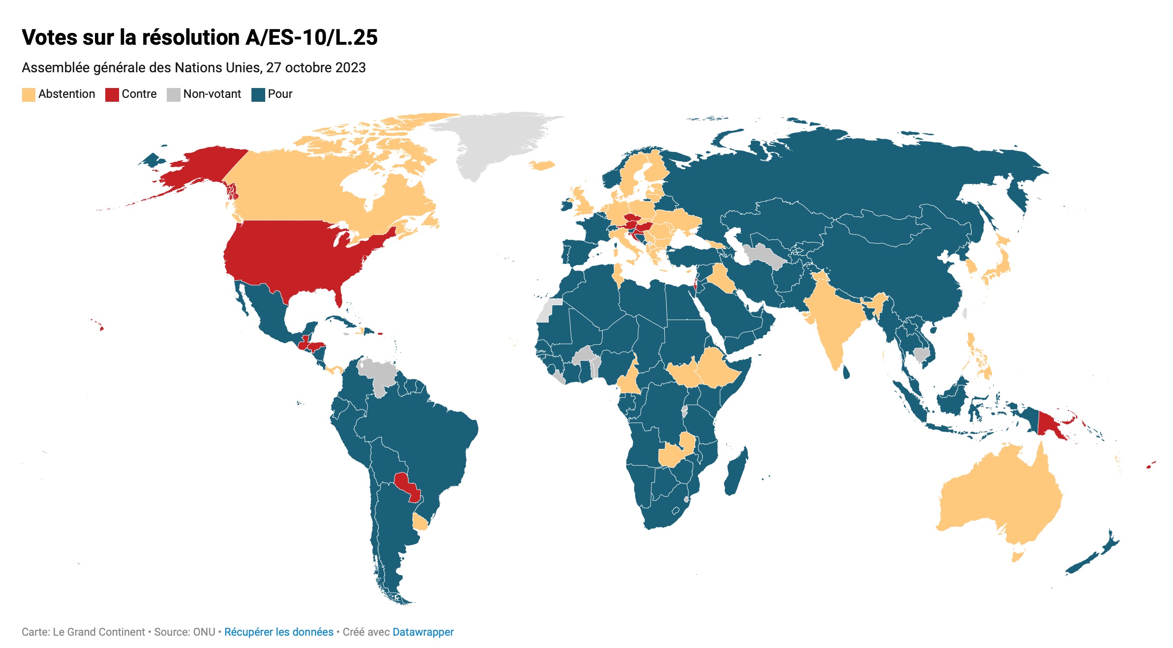 Une seconde carte montre les votes à l'Assemblée générale de l'ONU sur une résolution (non contraignante) demandant une trêve humanitaire. On voit, par comparaison avec la première carte, que l'Union européenne n'a plus une position commune.