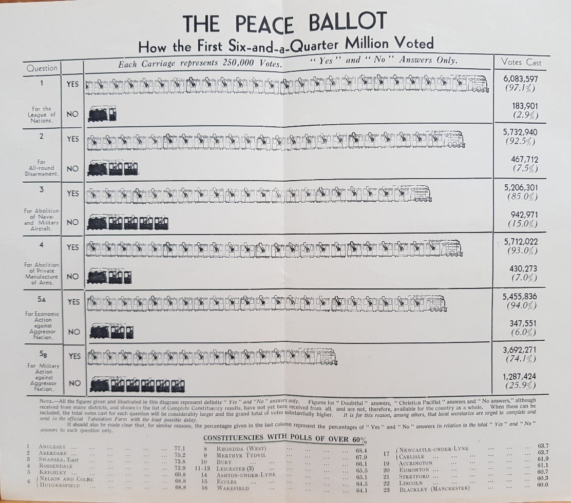 Les résultats du “Peace Ballot” ou scrutin pour la paix, organisé en Grande-Bretagne en 1934-35 par l'association pour la Société des Nations (League of nations Union, LNU). Plus de onze millions de personnes répondirent, la LNU ayant à elle seule 400 000 adhérents. Les résultats montraient le soutien déterminé de l'opinion publique britannique à un système de sécurité collective fort, capable de contrer d'éventuels agresseurs par des mesures militaires. la SDN, on le sait, n'avait pas ce genre de moyens. C'est un exemple des réactions très diverses au traumatisme de la 1re Guerre mondiale. Dans l'Allemagne vaincue, le ressentiment contre le traité de Versailles a été l'une des causes du mouvement national-socialiste d'Adolf Hitler.