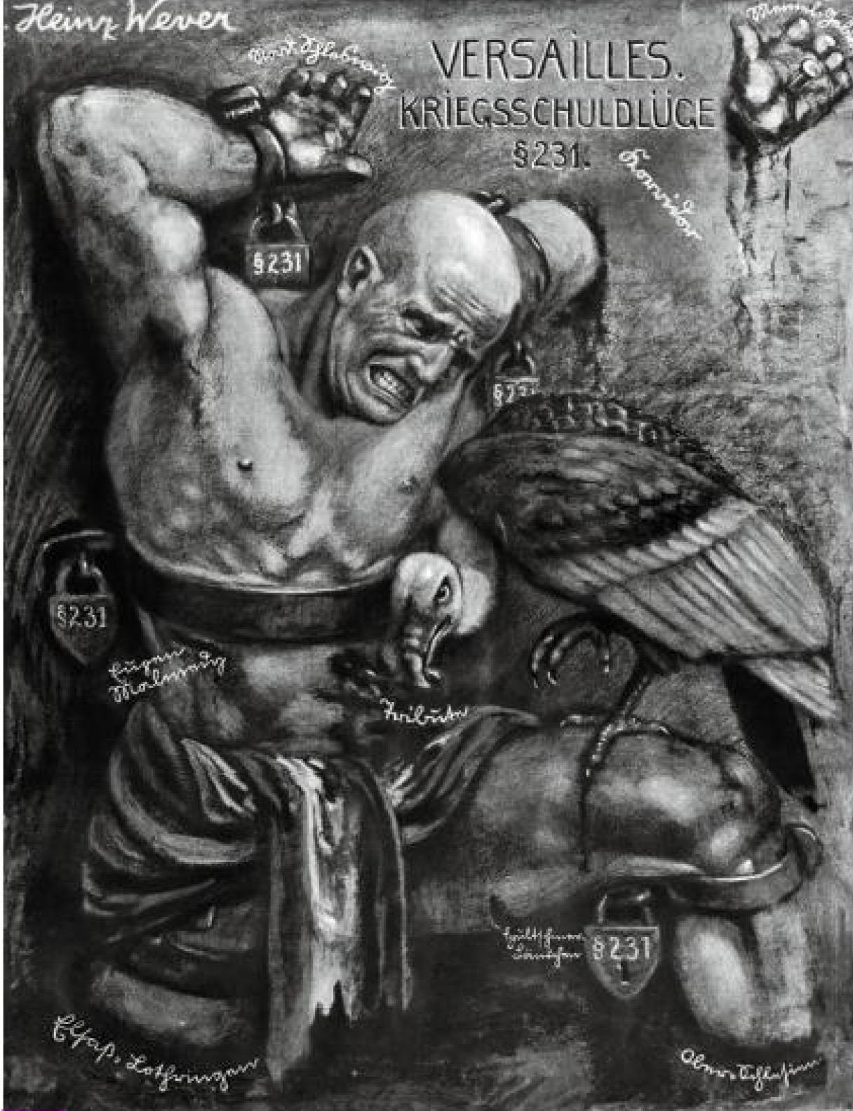 Une affiche allemande contre le traité de Versailles, réalisée par Heinz Wever en 1932. C'est l'année de la suspension définitive du paiement des réparations après le « moratoire Hoover », mais trop tard, puisque Hitler arrive au pouvoir en janvier 1933. L'Allemagne vaincue est présentée comme un Prométhée enchaîné, dans le style expressionniste de l'époque. C'est une victimisation et l'expression d'un ressentiment qui confine à la haine (livre, p. 179).