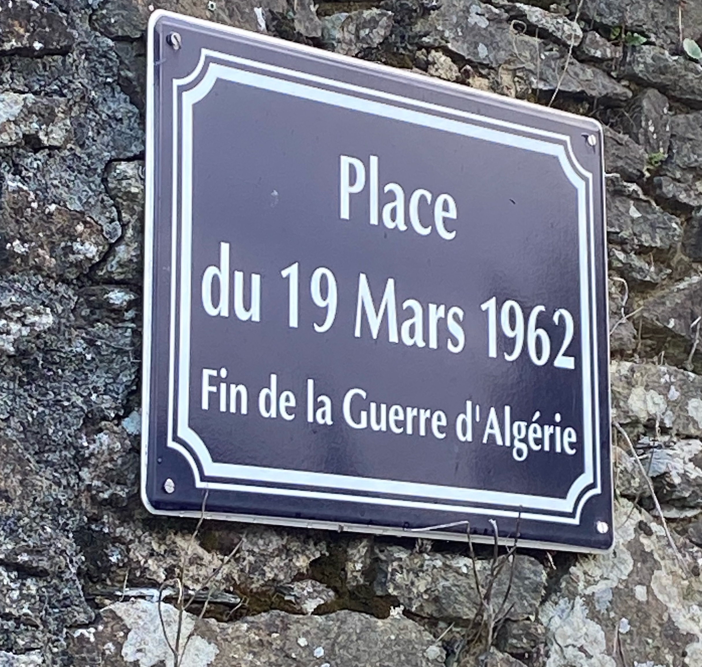 La place du 19 mars 1962 à Guimiliau, Finistère. On remarquera que les accords d'Évian sont commémorés comme « fin de la guerre d'Algérie », et non au titre de l'indépendance algérienne comme le font les Algériens. La mémoire française la plus consensuelle privilégie ainsi le soulagement au terme d'un conflit éprouvant qui a divisé la nation.