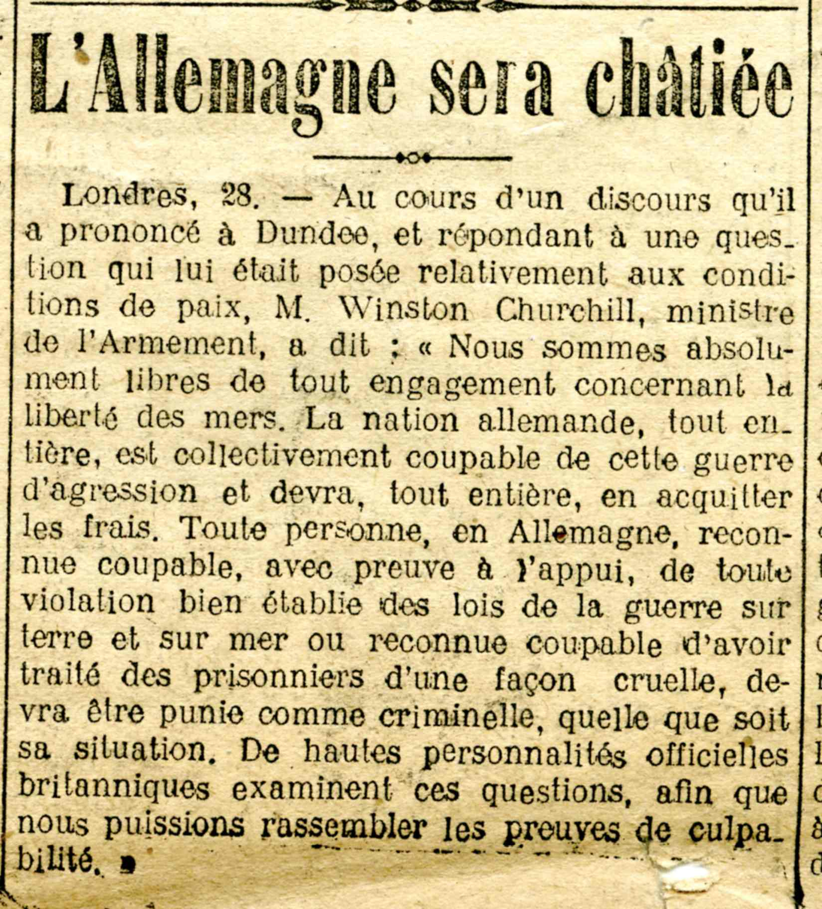 La Gazette de Liège du 1er décembre 1918. La Belgique avait été occupée et durement traitée par l'Allemagne. L'opinion belge attendait donc que l'Allemagne paie. En France, la campagne électorale de 1919 vit la victoire du Bloc national, une coalition de droite élue sur le slogan « l'Allemagne paiera ». Clemenceau put s'appuyer sur cette majorité, dite « chambre Bleu horizon », de la couleur des uniformes des « poilus », pour négocier le traité de Versailles qui imposa des conditions très dures à l'Allemagne vaincue, notamment le paiement de « réparations ». Ce terme partait du principe que l'Allemagne était coupable du déclenchement de la guerre, ce qui fut affirmé dans l'article 231 du traité.