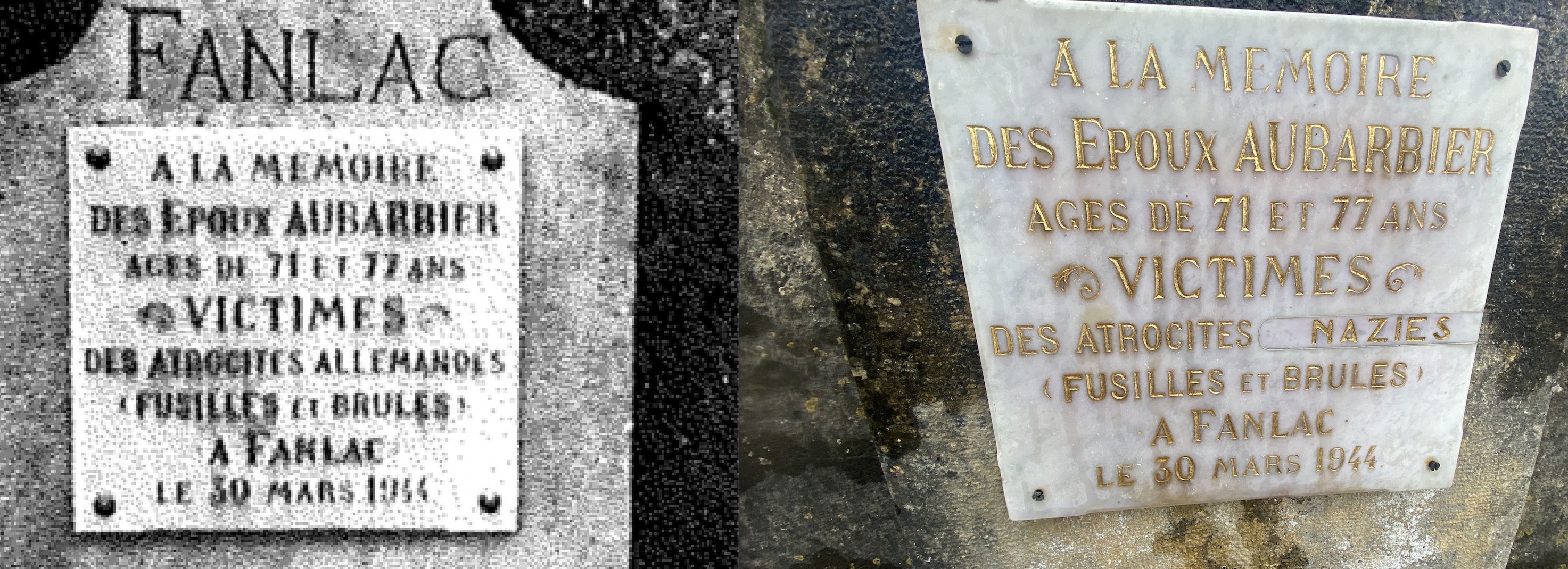 Un exemple de politique mémorielle : la stèle dédiée aux époux Aubarbier, fusillés en 1944 pour faits de Résistance dans le village de Fanlac en Dordogne. La stèle posée à la Libération évoquait « les atrocités allemandes ». Plus tard, elle est réécrite. On parle désormais d'atrocités « nazies », ce qui évite d'imputer aux Allemands une culpabilité collective et facilite ainsi la réconciliation et la contruction européenne. La notice sur les époux Aubarbier est représentative du devoir de mémoire : on se souvient de ceux qui se sont sacrifiés pour la patrie. On notera que les Aubarbier sont honorés en tant que « victimes » plutôt qu'en tant que héros. La victimisation, également présente dans la chanson « Negro song », est souvent associée au « devoir de mémoire ».