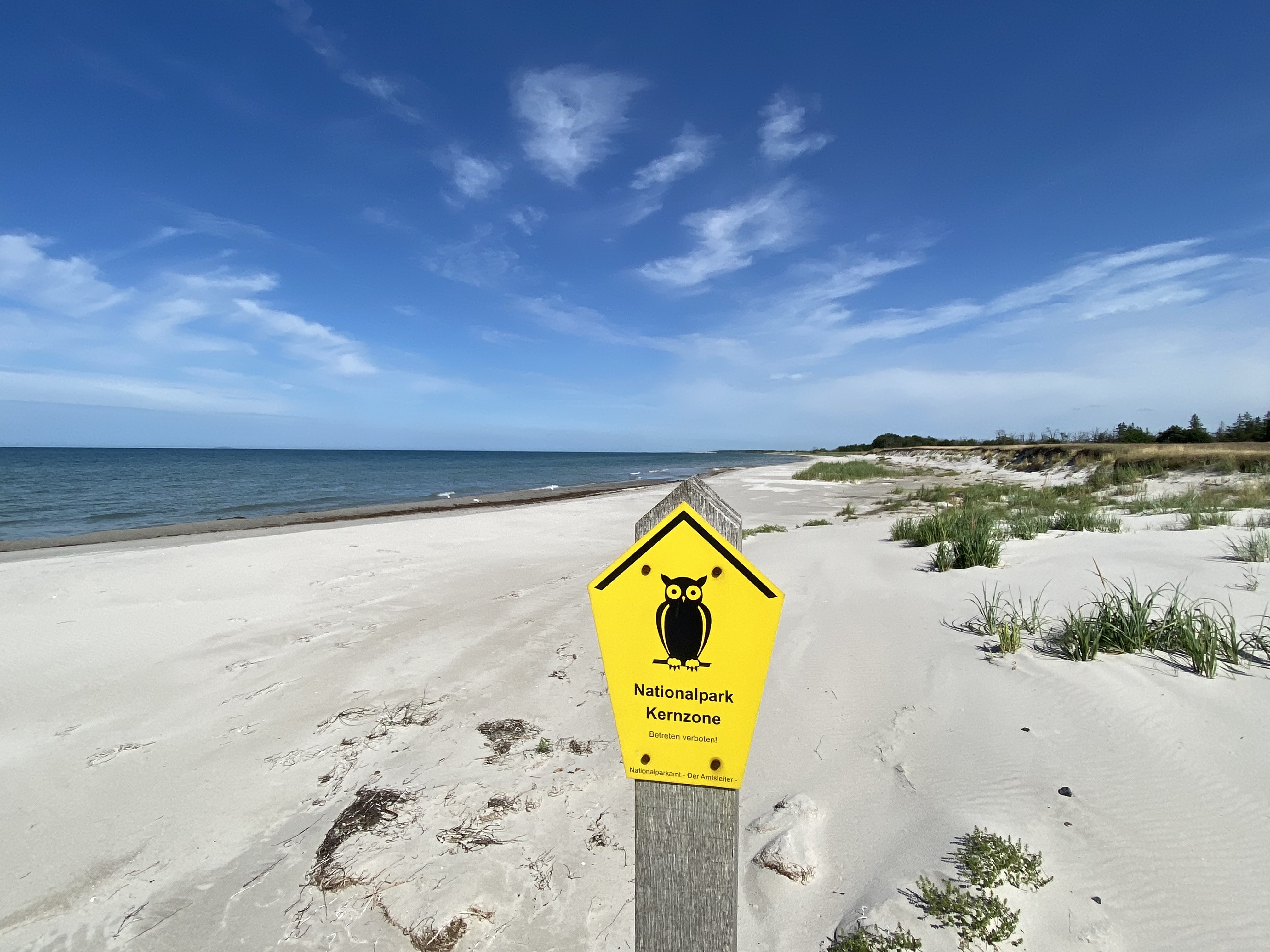 La limite de la zone centrale du parc national des lagunes de Poméranie occidentale en Allemagne, sur la Mer Baltique, le 16 juillet 2025. Le parc a été institué par le gouvernement de la République démocratique allemande la 12 septembre 1990, juste avant la réunification qui est entrée en vigueur le 3 octobre suivant. Certaines zones font l'objet d'une protection intégrale, qui implique l'interdiction faite au public d'y accéder. L'idée des parcs nationaux est née aux États-Unis au XIXe siècle et sera étudiée dans la conclusion de ce thème d'étude.