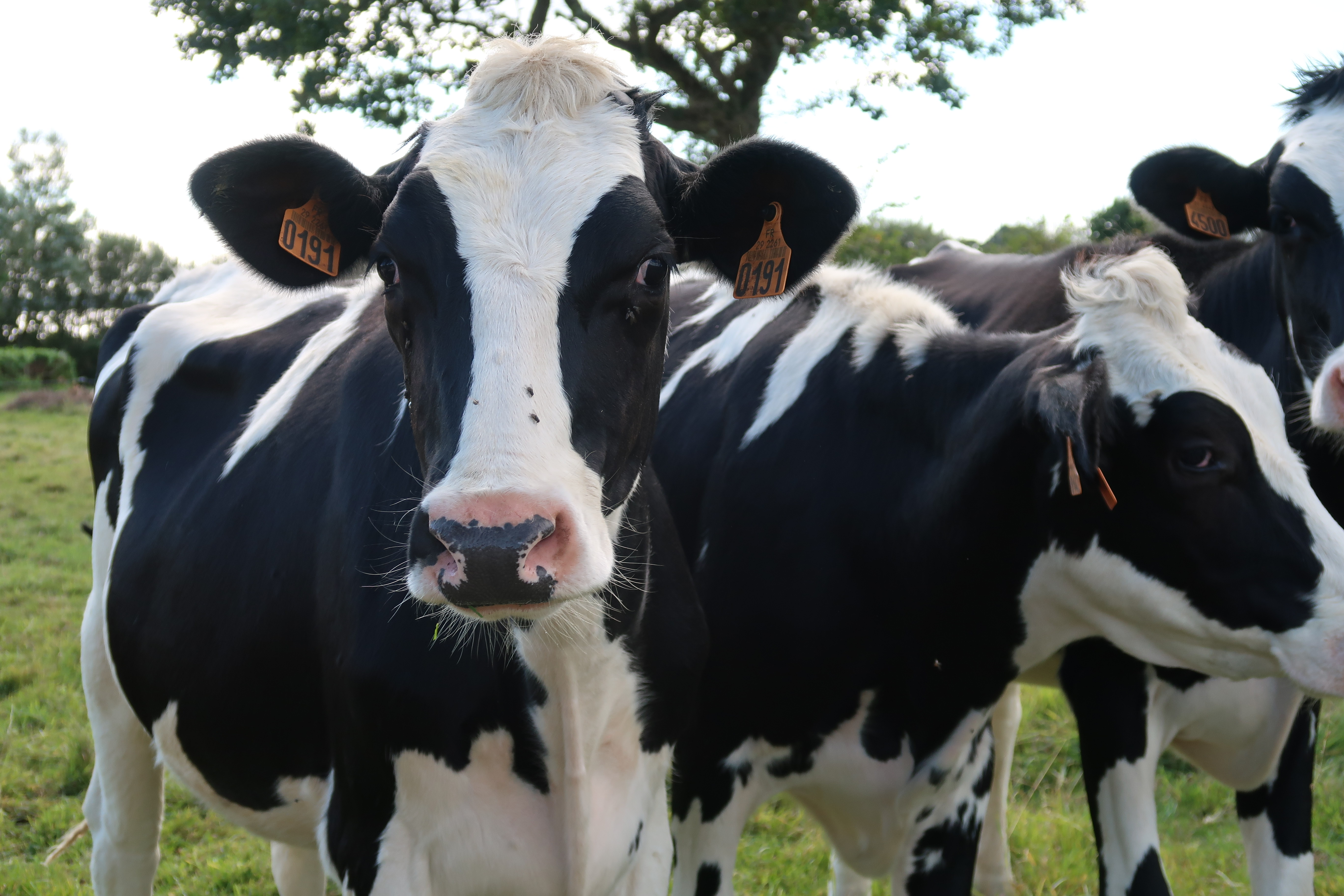 Des vaches laitières à Logonna-Daoulas le 30 août 2020. Derrière l'apparence « naturelle » des paysages ruraux et des animaux domestiqués, on oublierait facilement que l'environnement a été façonné en profondeur par les sociétés humaines. Ces animaux placides sont des représentants d'une race bovine (« Pie Noir ») optimisée pour la production laitière (3600 litres de lait par an). Une fois la phase de production laitière optimale achevée, les vaches sont « valorisées » pour la boucherie [voir la documentation de l'association agronomique Solagro].
